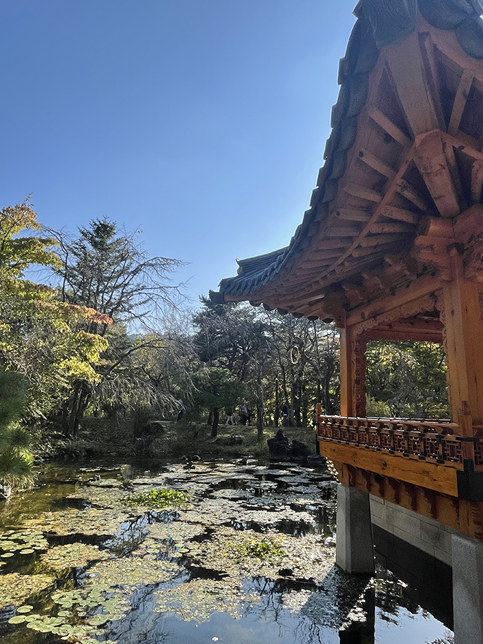 미술관 입구에 들어서는 순간, 뭔가 다른 세상에 온 기분이었어요. 마치 조용한 숲 속에 신비롭게 자리 잡은 건축물 같은 느낌이랄까요? 입구로 들어가는 길은 '보화문'이라 불리는 전통적인 느낌의 게이트로 시작하는데, 이게 또 분위기를 업 시키더라고요. 산책로를 따라 걸으면 '읍청문', '연못'을 지나게 되는데, 이 길마저도 한 폭의 그림 같았어요. 특히 이 계절엔 단풍이 살짝 올라오는 모습도 보여서 자연과 건축의 조화가 참 좋더라고요. 산책로를 천천히 걷다 보니 도착하게 된 미술관! 안에 들어서니 독특한 아치형 구조가 먼저 보이는데요, 건축물 자체도 굉장히 인상적이고 전시와의 매치가 아주 찰떡이었답니다.