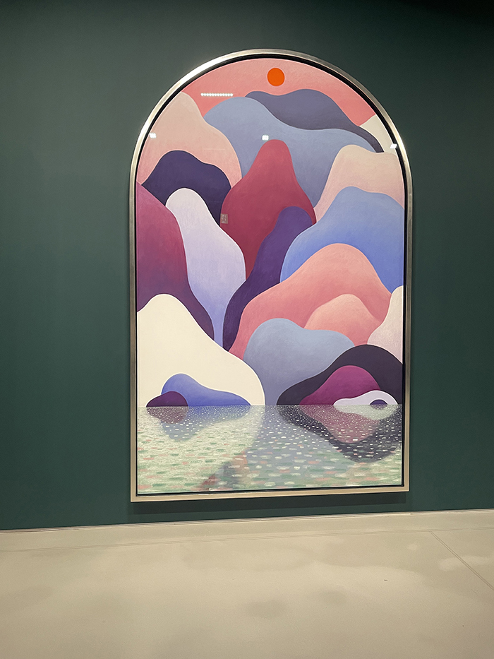 전시에서 꼭 하나 추천하고 싶은 작품은 '산과 금동 용두보당'입니다. 국보인 고미술품과 현대 벽화의 어우러짐이 눈을 떼지 못하게 만들더라고요. 또, 2층으로 올라가는 계단에 자리한 거대한 폭포 그림은 사진으로 다 담을 정도로 어마어마한 크기와 색감이 압권이었어요. 계단을 따라 올라서는 순간 전시 공간이 자연스럽게 이어지는데, 이런 공간 설계 하나하나가 참 세심하더라고요. 그리고 '단풍 포인트'로 나가 단풍 든 산을 보며 잠시 여유를 느끼는 것도 빼놓을 수 없는 재미였답니다. 특히 테라스나 창문으로 보이는 뷰가 예술이라 카메라를 손에서 뗄 수가 없었어요.