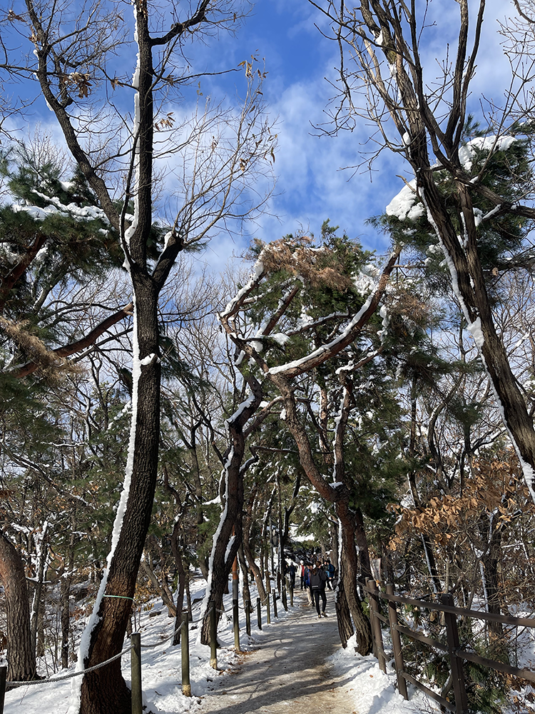 입구에 발을 들이자마자 겨울 특유의 공기가 확 다가오는데, 이게 참 맑고 뽀득한 기분을 줘요. 계절상 완벽히 잎이 지고 쌓여 있는 산책로와 눈길이 도시의 산에서는 상상하지 못했던 평온함 그 자체였어요. 등산 초반은 나무 사이로 스며드는 햇살이 부드럽게 내려와 따뜻한 느낌마저 들더라고요. 또 산 중턱에는 눈 쌓인 나뭇가지들이 장식해준 설경이 펼쳐지는데, 여기는 말 그대로 사진으로 못 담을 만큼 아름다웠어요. 산행하기 좋은 뽀송뽀송한 흙길이 발아래 계속 펼쳐져서 큰 부담 없이 움직일 수 있었어요. 그리고 무엇보다, 지나가는 사람들 간의 미소와 산행 분위기에서 느껴지는 여유가 좋았어요. 도심 속 소소한 힐링을 즐기려는 산객들이 만드는 담백한 에너지가 확 느껴졌답니다.