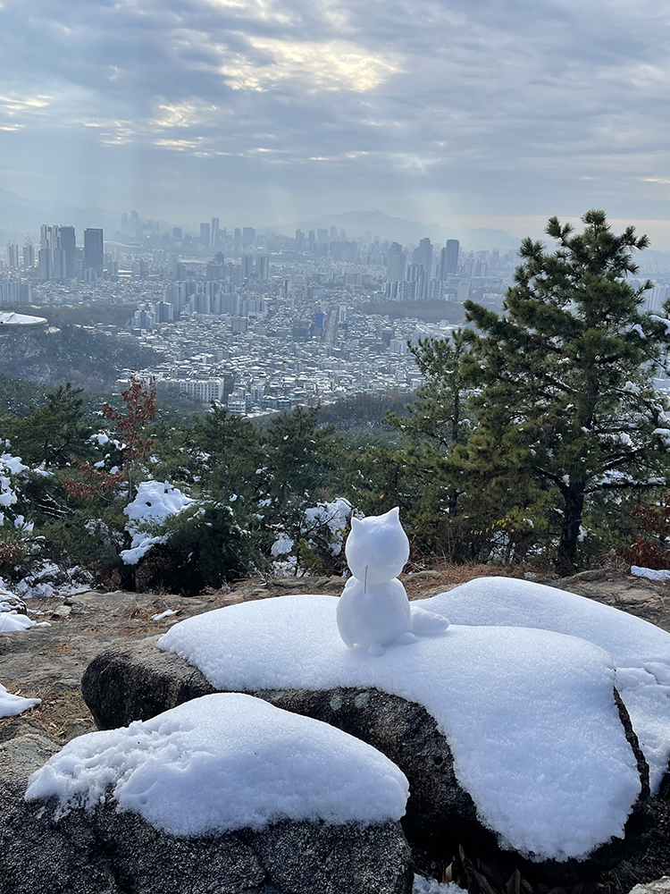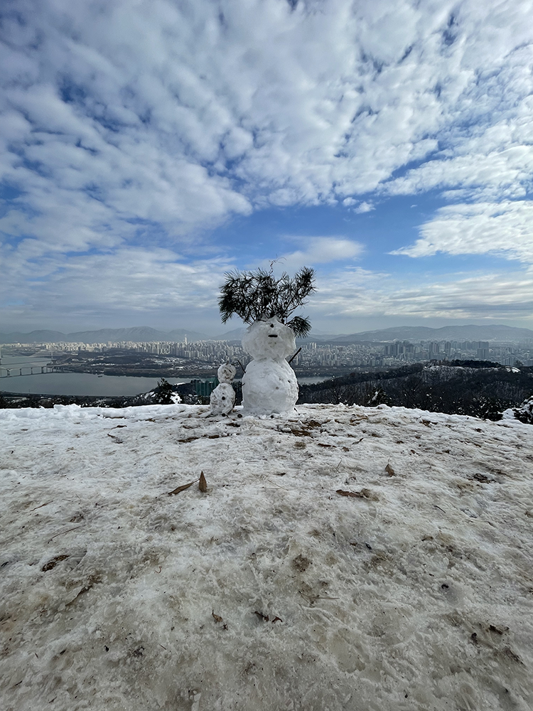 산 정상, 특히 아차산 4보루에서 내려다본 뷰는 정말 예술입니다. 아차산의 설경도 멋지지만 서울 도심과 한강이 어우러진 풍경은 정말 놓치기 아까운 그림이에요. 직접 눈으로 봤을 때 느꼈던 그 압도적인 감정은 아직 잊혀지지 않아요. 개인적으로 가장 좋았던 순간은 중간중간 등산객들이 만들어 놓은 눈사람들을 볼 수 있는 것이었어요. 한 주의 스트레스가 확 풀리는 기분 좋은 경험이었구요. 햇살이 살짝 올라왔을 때 눈 위로 반짝이는 장면은 여기가 천국인가 싶을 정도로 좋았습니다. 같이 산행하던 친구도 감탄사를 내뱉을 만큼 서울 속에서 장대한 자연의 모습을 만날 수 있었어요. 갑갑한 마음이나 생각이 정말 힐링되는 순간이었답니다.