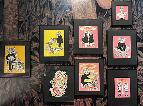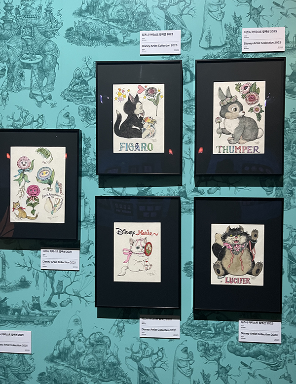 전시장에 도착하자마자 첫인상부터 압도! 입구에서부터 독특하고 몽환적인 분위기가 물씬 풍기더라구요. 벽 한편에는 유코 히쿠치의 대표작이 큼지막하게 전시되어 있어 '아, 정말 이 작가가 이런 세계관을 가지고 있구나'라는 게 한눈에 보였어요. 밝고 화려한 배경과 그 속에서 대비되는 섬세한 펜화 작품들이 처음부터 관람객들의 시선을 사로잡는데 성공한 느낌이었답니다. 입구에서부터 보이는 연출들이 전시의 시작을 더 몰입감 있게 만들어줬어요!