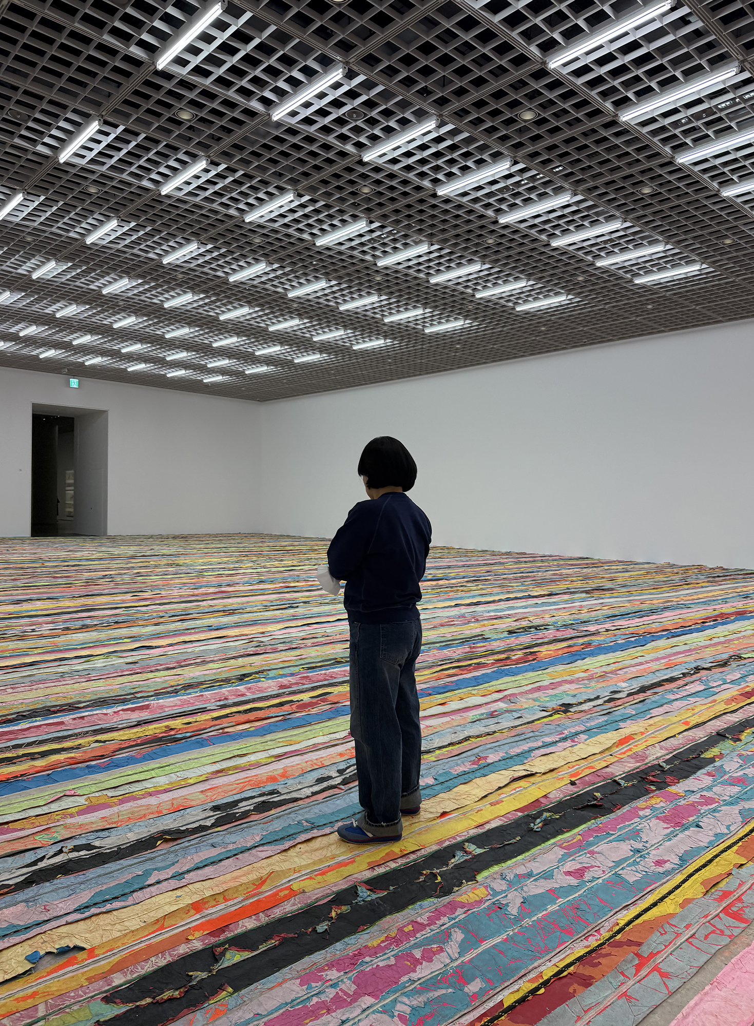 이번 전시에서 가장 기억에 남는 것은 몇몇 설치 작품이 관객이 직접 작품 위를 걷거나, 사이를 통과해야만 감상할 수 있다는 점이었어요. 평면 회화를 벽에 걸어놓고 감상하는 방식이 아니라 공간 자체가 하나의 거대한 작업이 되어, 관객의 몸이 작품의 일부처럼 흡수되는 느낌이 듭니다. 전시 제목인 Keep Walking이 단순한 은유가 아니라, 정말로 "걸음" 자체가 작품 감상의 중요한 방법이라는 사실을 직접 체감할 수 있어요.
