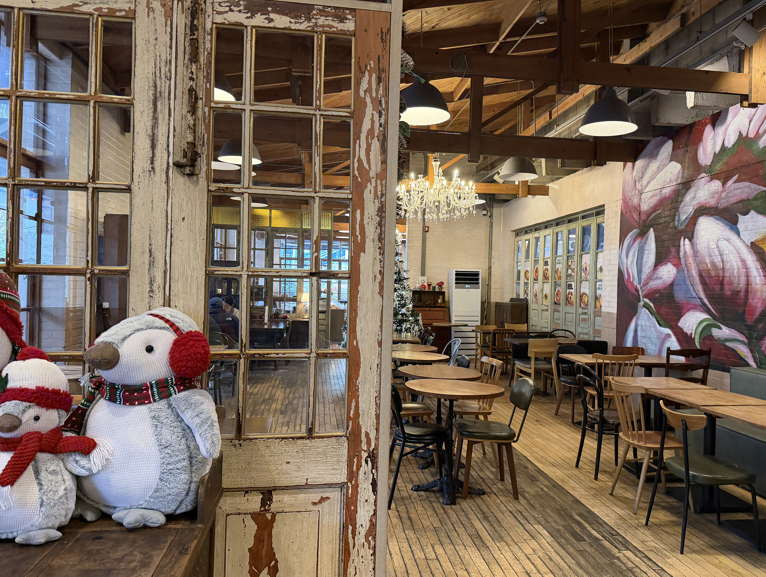 공간이 넉넉한 편이라 붐비는 느낌이 덜하고 여유롭게 앉기 좋아요. 그룹 테이블도 많고 단체석도 있어서 친구랑, 가족 모임도 문제 없을 것 같아요. 저는 특히 안쪽 공간에 배치된 벽난로가 가장 인상적이었는데요. 모형이 아니라 실제 나무 장작을 떼고 있어서 유럽의 산장에 여행 온 기분은 만끽할 수 있었습니다. 혹시 이런 감성 좋아하시고 근처에 거주하신다면 겨울 시즌에 한 번쯤 가볼만한 곳인 거 같습니다.